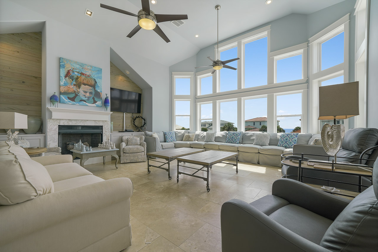 Sea Glass is a Gulf-front stunner offers 6 bedrooms and 7 baths, comfortably sleeping up to 22 guests. With two spacious dining tables and an open layout that flows from kitchen to living room, there’s room for everyone to gather and feast together. Vaulted ceilings, a private pool, elevator, and panoramic beach views create a setting that’s as breathtaking as it is functional — perfect for Thanksgiving togetherness by the shore.