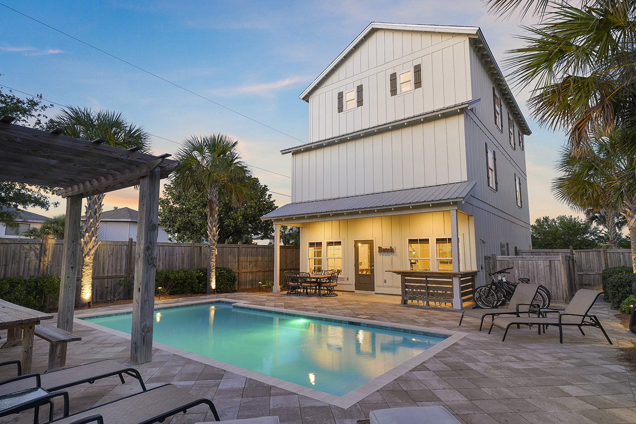 Casa Blanca is a three-story coastal retreat with 7 bedrooms that sleep up to 24 guests — ideal for large family gatherings and holiday celebrations. The open layout features a farmhouse-style dining table, multiple al fresco dining options, and a spacious kitchen designed for togetherness. Outside, a private heated pool and inviting lounge areas set the scene for laid-back coastal living, while a large bunk room makes this home as fun as it is functional. Just a 4-minute walk to the beach, with a complimentary golf cart included.